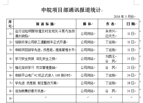 申皖項目部積極響應公司新聞宣傳采編發要求,3月份共計完(wan)成宣傳(chuan)稿件8篇,內(nei)容涉及公司(si)和項目(mu)部的生產(chan)以(yi)及管理(li)工作(zuo)。其中項目(mu)部經理(li)丁延剛一人就獨立擔綱發稿(gao)4篇(pian),占申皖(wan)項目(mu)部稿件(jian)數(shu)量的50%,并且也(ye)成為(wei)公(gong)司3月份網(wang)站稿件個人(ren)采(cai)寫發(fa)稿數量最多(duo)的人(ren)。