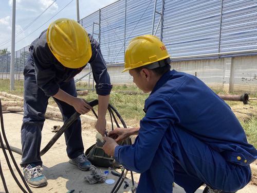 上(shang)午八時四十六分,檢修工作(zuo)有序開展,首先拆(chai)除深(shen)井泵的(de)連接(jie)法蘭(lan)和(he)短接(jie)。安裝起吊尼(ni)龍吊帶開始起吊第一(yi)節管(guan)道(dao),整個系統管(guan)道(dao)有十五節管(guan)道(dao)法蘭(lan)組成,由于長時間(jian)在(zai)水中濕泡,螺栓基本銹蝕,難(nan)以拆(chai)卸。大家應(ying)是(shi)一(yi)節一(yi)節進行拆(chai)卸和(he)起吊。當時室(shi)外(wai)氣(qi)溫高達42度,底坑檢修作業空間較小,大家只能輪換交替檢修工作。中午吃完飯又投入了深井泵的電纜頭制作和防水絕緣中,當運行巡檢人員來到搶修現場時,贊揚檢修人員冒高溫、保發電的敬業精神。